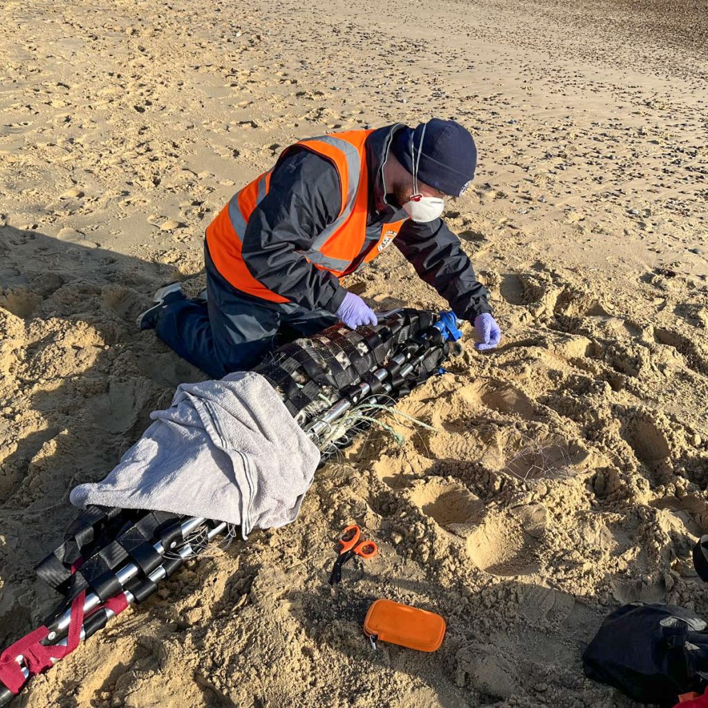Using specialist rescue equipment, the seal pup was successfully caught and assessed, allowing Medics to carefully remove as much loose entanglement material as possible. Examination revealed multiple wounds across the body, consistent with netting cutting into the skin.