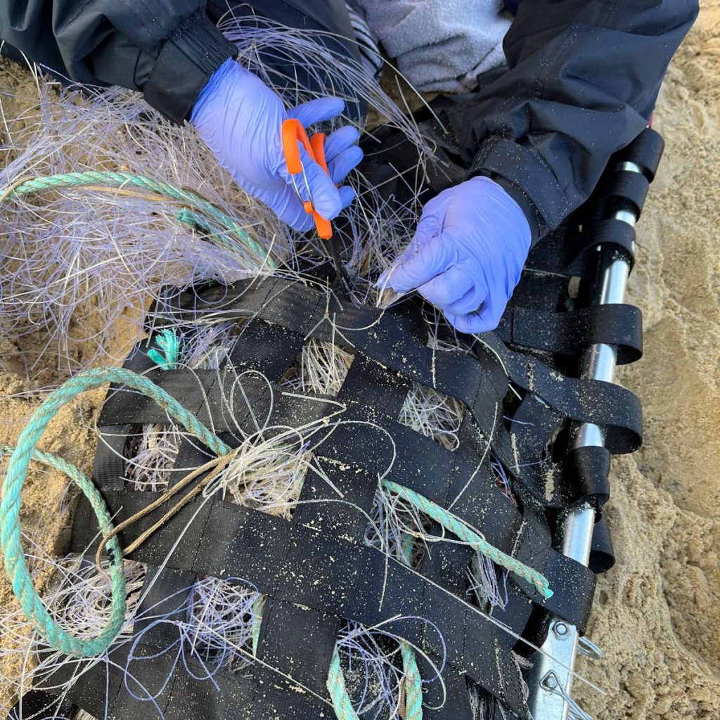 The majority of the netting was removed during the initial response. However, the tightest constricting section of material around the pup’s neck could not be safely removed at the scene. Where entanglement is deeply embedded in a seal’s neck, rapid removal can cause serious complications, including profuse bleeding, additional tissue trauma, and shock. For this reason, full removal is often safest in a controlled veterinary setting, where it can be loosened gradually with pain relief, close monitoring, and any immediate treatment can be provided.
